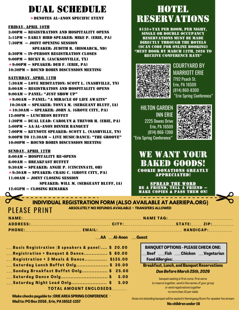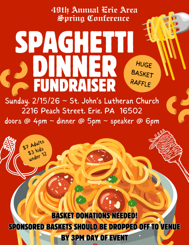 The Erie Area Spring Conference Committee meets the 2nd Tuesday of every month at 7:00pm at the Alcanon Club, 926 East 6th Street, Erie, PA 16507.